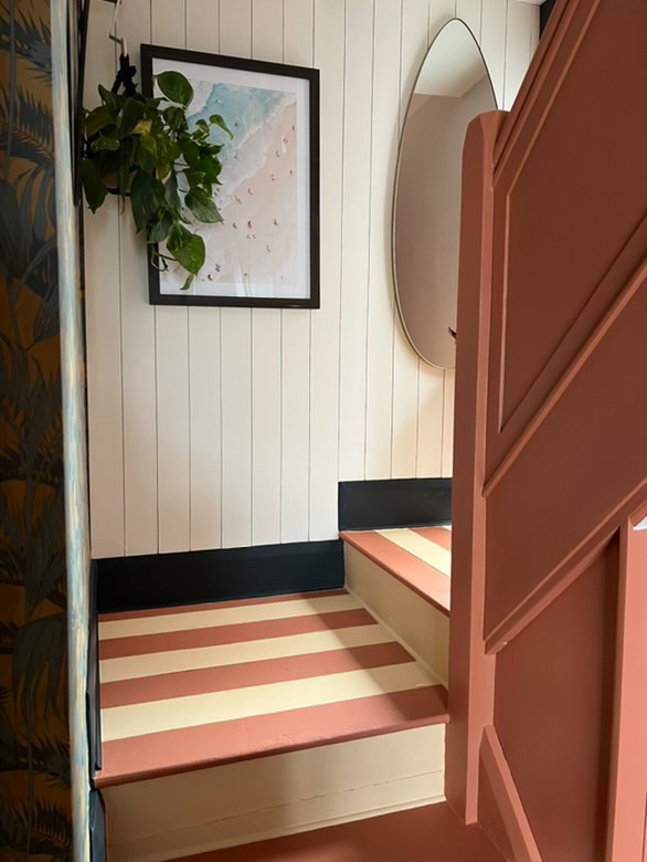 Make a standout feature out of the staircase. Painting the spindles and risers in an unexpected colour, like blue, can help to create an element of surprise. Playing around with clever colour blocking here can really turn a room into an exciting space.